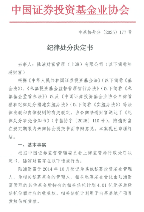 根据中基协公告内容,陆浦财富于2014年10月登记为其他私募投资基金管理人,其管理的相关私募基金曾受让由该公司管理的其他基金所持有的某信托计划4.01亿元劣后级信托份额对应的收益权,而该信托计划最终用于向某房地产项目发放信托贷款。