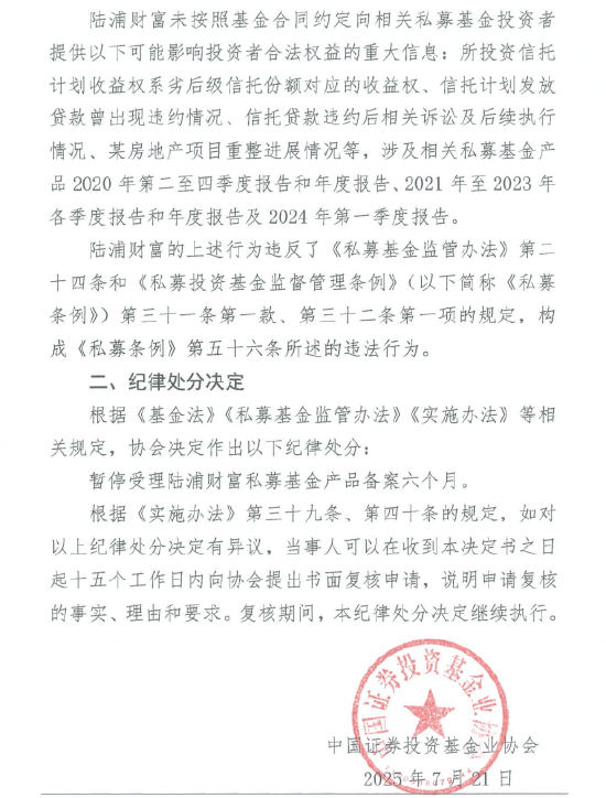基于《中华人民共和国证券投资基金法》《私募投资基金监督管理暂行办法》《中国证券投资基金业协会自律管理和纪律处分措施实施办法》(以下简称《实施办法》)等相关规定,中基协最终决定对陆浦财富采取“暂停受理私募基金产品备案六个月”的纪律处分。