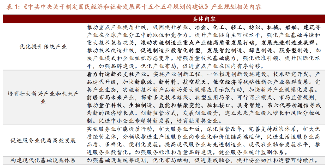 《中央关于制定国民经济和社会发展第十五个五年规划》:明确提出“建设现代化产业体系,巩固壮大实体经济根基”为重点任务,从优化提升传统产业、培育壮大新兴产业和未来产业、促进服务业优质高效发展、构建现代化基础设施体系四大维度作出部署。
