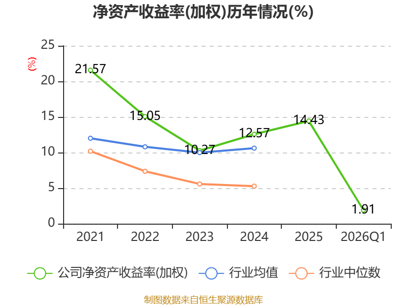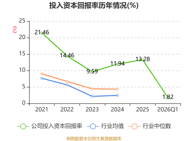 盈利能力方面, 2026年一季度公司加权平均净资产收益率为1.91%,同比下降0.83个百分点。公司2026年第一季度投入资本回报率为1.82%,较上年同期下降0.78个百分点。