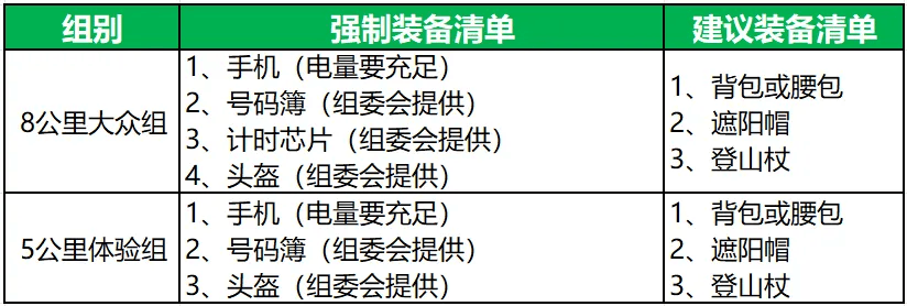 越野跑是一项存在一定风险的山地户外运动,与普通路跑有着本质的区别。要求选手应具备独立应对野外各种状况的能力包括突变的恶劣天气、复杂多变的路况和可能途中出现的野生动物。参加越野跑活动,赛事组委会根据赛道环境情况设定的强制装备要求是必要的,强制装备是选手应对突发情况时的必要保障,并且这仅仅是最低配置标准。每个越野跑者必须根据自己的需求进行装备准备,必须能够真正保护自己在变化多端的山地局部气候下,保持安全和良好的状态。这是一种尊重自己、热爱生命、敬畏自然的态度。