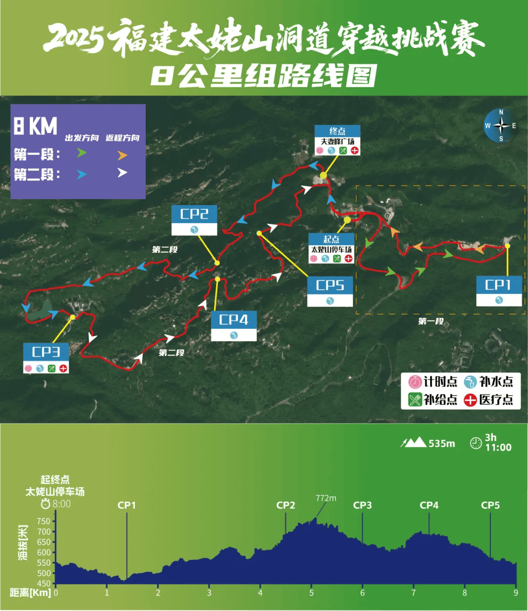 太姥山停车场—沿上山公路下行—进入玉湖游览区游览道路—沿路前行—太姥娘娘雕像广场—玉湖庵—右转—起点拱门旁绕过—太姥山导游服务中心—夫妻峰广场—国兴寺—龙潭湖水坝上经过—龙潭湖栈道—乌龙岗路口左侧下行—萨公岭—柳杉林—太姥之心—聚仙亭—龟蛇相会—将军岩—仙人锯板—玉兔听潮—果然名山—云标石—玉猴照镜—三伏腰—滴水洞—高僧说法—湖光山色—CP1(九鲤湖)—香山寺—沿路前行—五百罗汉堂—左转悬空铜殿—仙掌岩—拨云峰架笔峰—一线天—云标亭云标石—右转—沿路前行—石蛋—细粒花岗岩岩脉—晶洞花岗岩—观海栈道—沿路前行—终点(夫妻峰广场)累积爬升:535米,累计下降:521米,关门时间3小时,共有补给点5个。