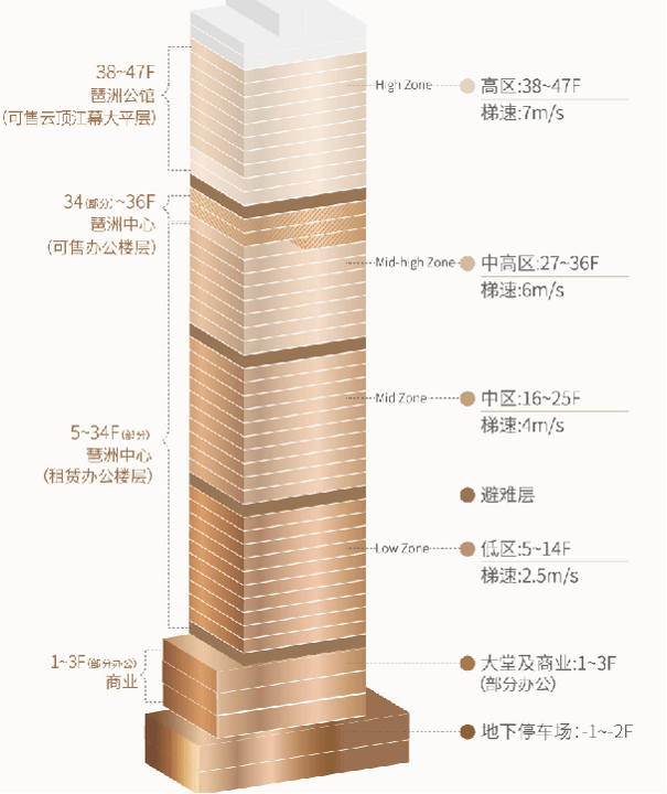 项目总建筑面积约 25 万平方米,其中写字楼部分约 18 万平方米,地上 42 层、地下 4 层,建筑高度 200 米,由国际知名设计团队打造,外立面采用 “参数化玻璃幕墙” 设计,通过光影变化呈现出 “数字流动” 的视觉效果,成为琶洲天际线的标志性符号。项目荣获 LEED 铂金级与国家绿色建筑三星双认证,其智能能耗管理系统可实现节能 40% 以上。