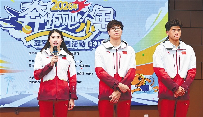 训练间隙,张雨霏、潘展乐、覃海洋走进该校科技楼报告厅,同学子们面对面分享成长历程、训练点滴与赛场夺冠的热血故事。