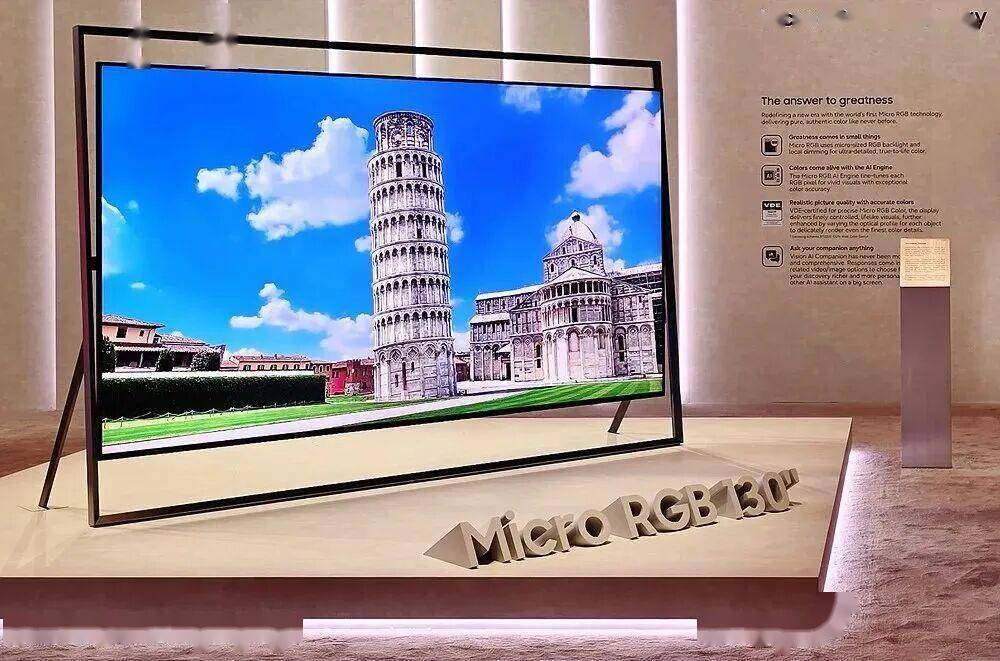 本届CES上,三星推出130英寸Micro RGB Mini LED巨幕以悬浮式设计吸引目光,其采用小于100微米的红绿蓝三色LED芯片,配合人工智能画质引擎,实现100% BT.2020色域覆盖。