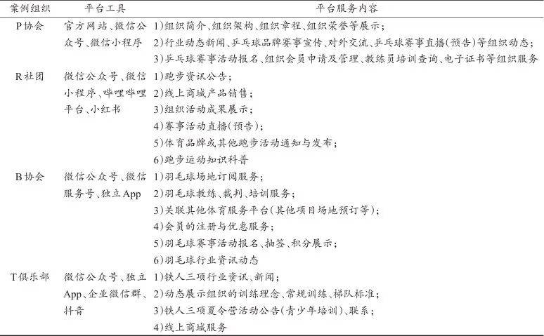 2024年10月—2025年4月,本研究团队通过电话、微信(小程序、公众号等)、网站等途径与体育社会组织负责人取得联系并进行深度访谈,整理出10万余字的访谈记录,并对其进行详细的梳理与分析。同时,通过参与式观察,深入了解上述体育社会组织的管理与服务流程,与组织成员进行交流,获得案例中技术与组织互构的细节与信息,形成体育社会组织数字化转型实践的关键资料(表1)。