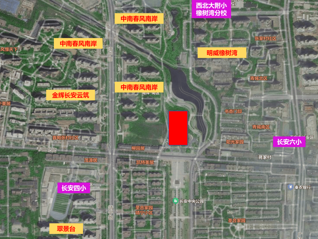 从该地块的位置来看,紧邻长安中央公园,其周边住宅区比较多,中南春风南岸、金辉长安云筑、风憬天下等小区均位于周边,并且还分布有长安四小、长安六小、西北大附小橡树湾分校等学校。