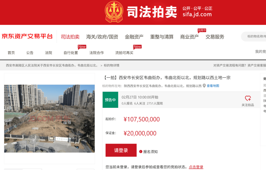京东资产交易平台上近日发布了《【一拍】西安市长安区韦曲街办,韦曲北街以北,规划路以西土地一宗》标的物即将被司法拍卖的预告信息,处置机构为西安市高陵区人民法院。