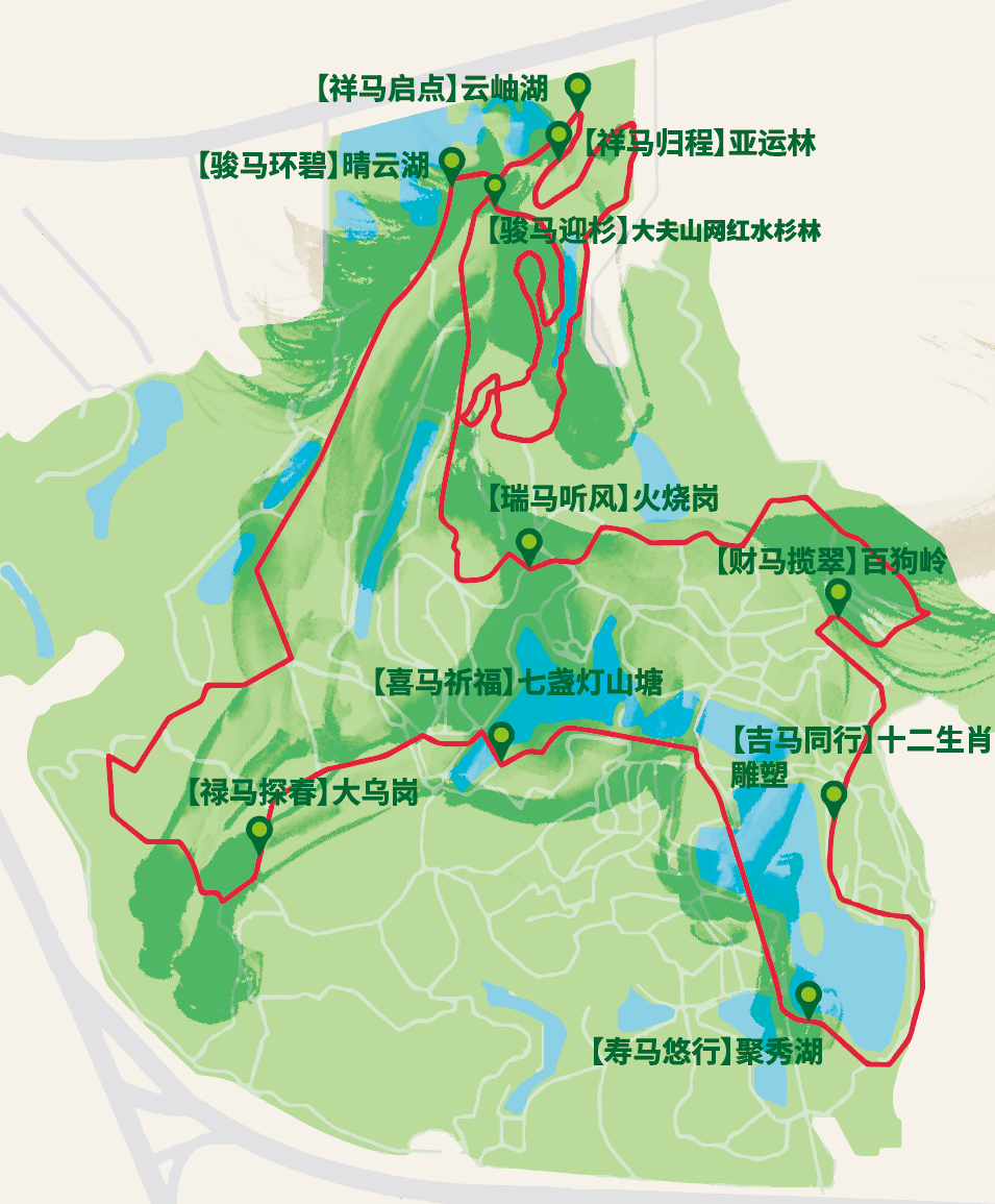 “跑马线、画马形、集马印、迎马运”结合番禺区大夫山特有的森林绿道与岭南生态资源特色,在大夫山已建成的生态步道、环湖碧道中,10处兼具自然景观与人文底蕴的特色节点被设置为“福马迎春”轨迹打卡点。活动期间,选手可通过走跑方式打卡大夫山、游览禺山春日盛景,在“画马轨迹”的沉浸式体验中,感受大夫山的生态魅力与番禺的岭南文化底蕴,解锁马年新春专属的运动乐趣,打卡点如下: