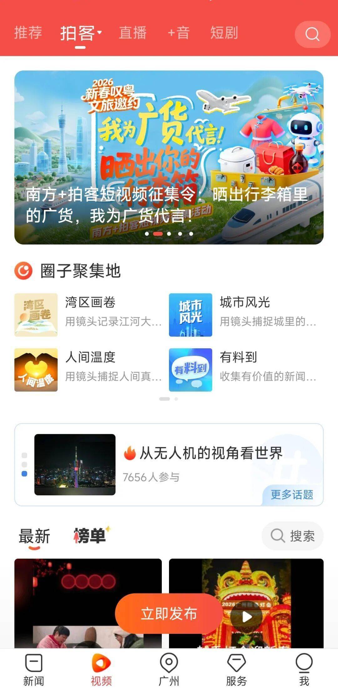 南方Plus客户端在视频页面中除推荐短视频外,还设置了“拍客”栏目,支持用户发布视频、图片和音频,并通过“拍客看广东”“宝藏乡村”“城市百态”等话题,引导内容共创。在此基础上,客户端还设置多个“圈子聚集地”,如“乡村记忆”“民生帮”“人间温度”等,用户可在圈子内发帖交流,形成相对稳定的互动社群。音频内容同样被纳入核心版面,“+音”栏目集合新闻早晚报、精选音频和播客内容。