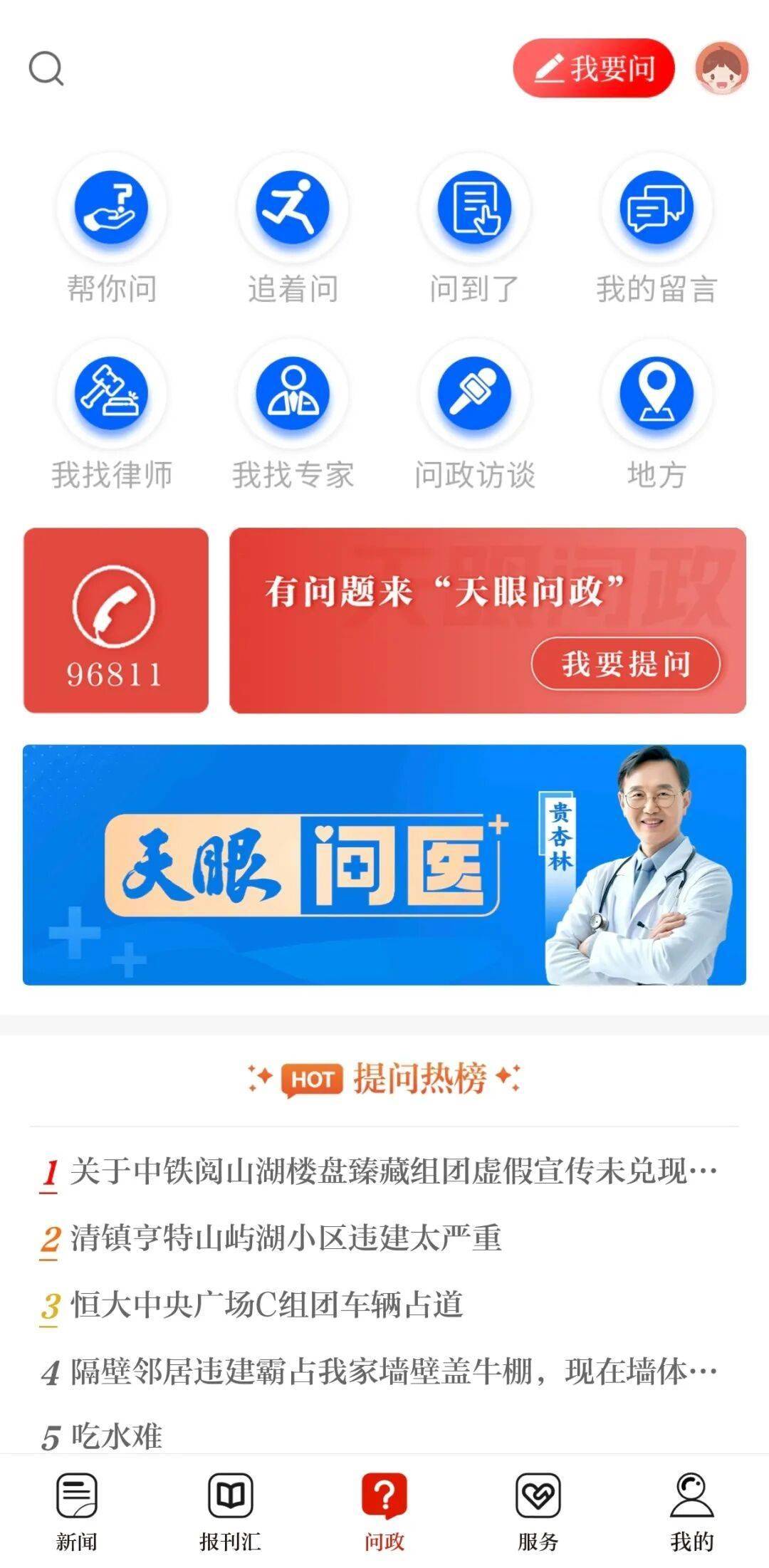 天眼新闻客户端则通过系列化品牌推进问政服务。“天眼问政”“天眼问教”“天眼问医”“天眼问法”等栏目形成差异化区分,并与96811民生服务平台联动运行。平台还设置“帮你问”“追着问”“问到了”等栏目,强调持续跟进;通过“我找律师”“我找专家”“问政访谈”等栏目,将问政内容延展为公共服务与知识传播。
