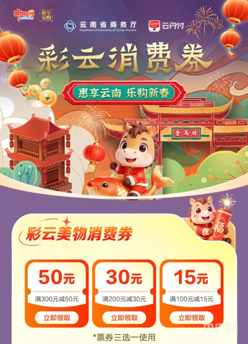 春节假期,云南省发放的彩云美物消费券(央广网发 来源:云闪付APP页面截图)