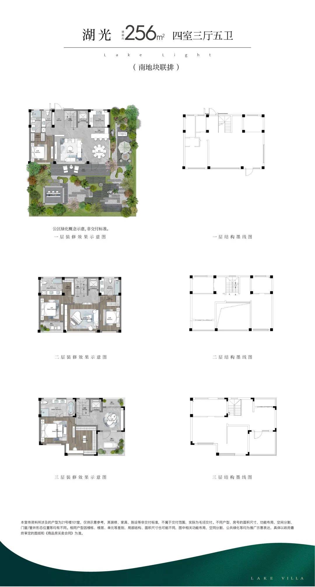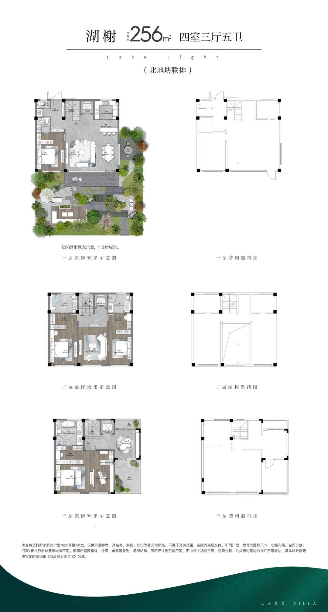 (*北地块联排边户)256平(四房三厅五卫)有独立的入户门,回家很有仪式感。三面宽的设计,通风采光极好。特意为老人设计了朝南的阳光房,非常贴心。主卧是酒店式的套房,自带卫浴,气度不凡。