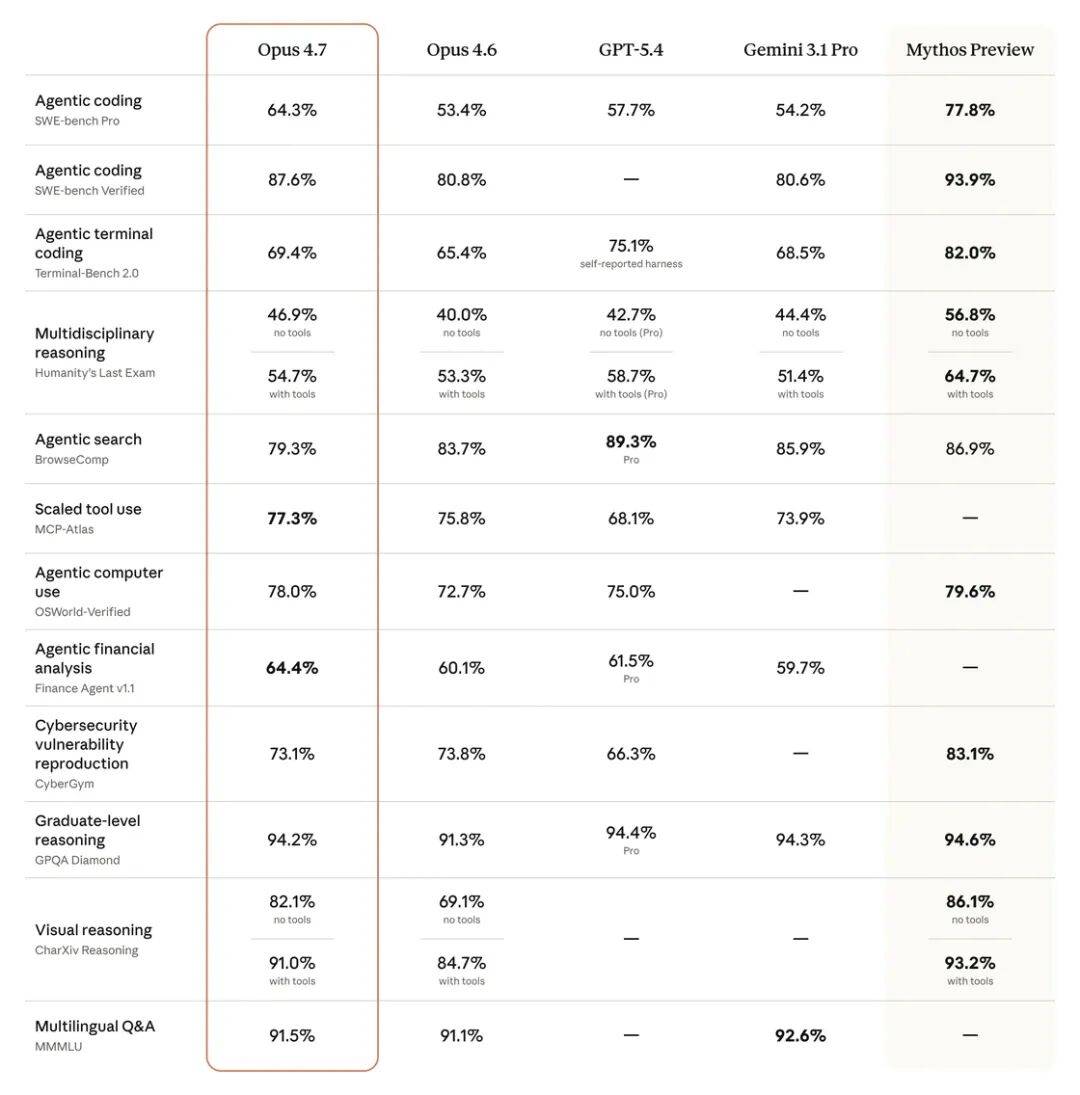 不过,Anthropic 表示,Opus 4.7 并未推动公司能力边界,其整体性能仍低于此前发布的 Claude Mythos Preview 模型,后者在多项评测中表现更优。