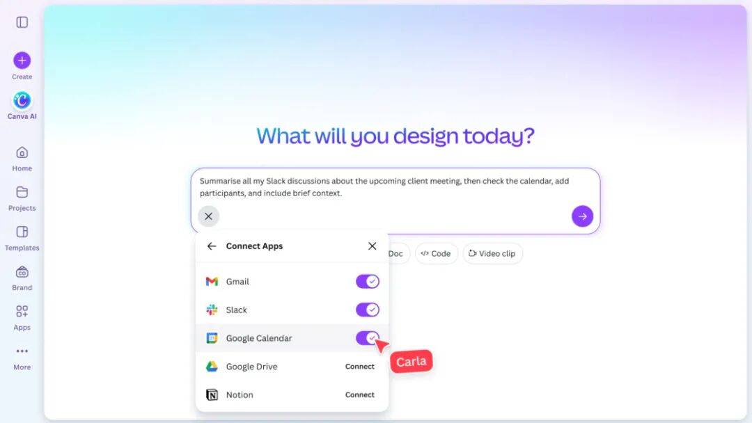 在智能化工作流方面,Canva AI 2.0 将应用场景拓展至日常办公处理。新系统打通了 Slack、Gmail、Zoom 和Google Drive 等常用办公软件,可直接提取音视频要点或聊天记录,生成文档。此外,还新增了支持后台离线运转的自动规划功能、全网调研能力、支持 HTML 文件导入修改的 Canva Code 2.0,以及能够根据需求描述一键生成结构化表格的 Sheets AI。
